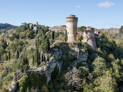 Within the town, mediaeval passageways twist beneath arches and between stone houses. A unique raised path runs above parts of the old centre, creating hidden corners where you can lean on a railing and look out over the tiled roofs and surrounding hills.